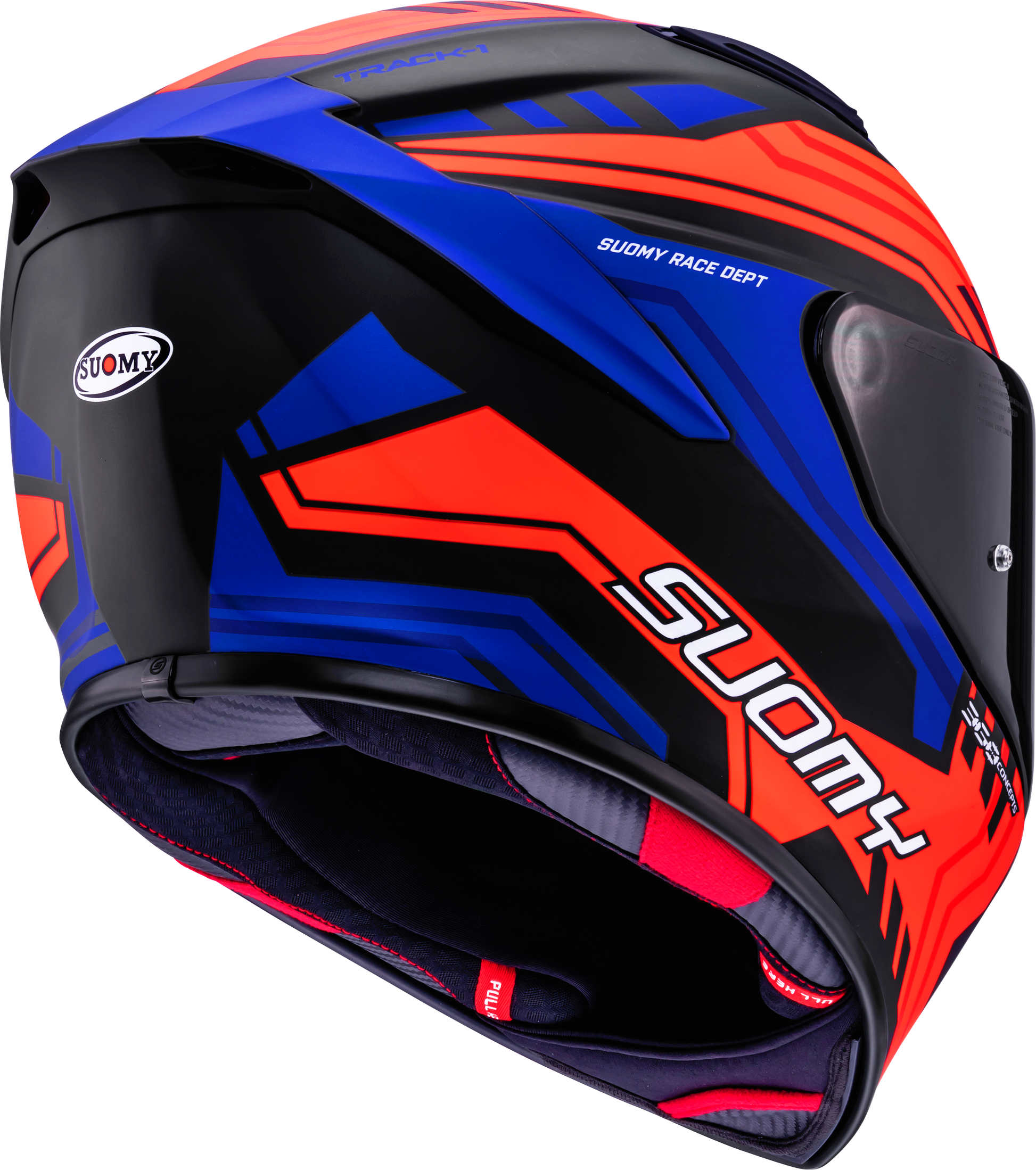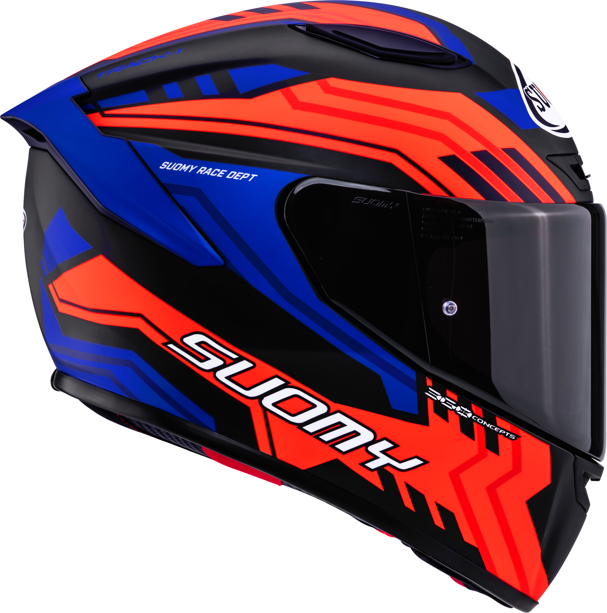 The Suomy Track-1 Framework Matt Black/Red/Blue combines a futuristic line layout with matte surfaces and strong contrasting colors. The angular frame elements convey power, dynamics, and precision – a design that perfectly suits sporty bikes and ambitious riders.