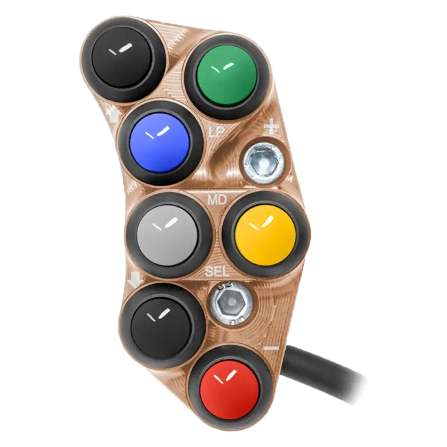 Ao contrário das unidades de interruptores de série, este painel de guidão de corrida foca nas funções essenciais para uso esportivo. O resultado é uma construção limpa, direta e orientada para o motorsport, que se encaixa perfeitamente na característica sem compromissos da Panigale.